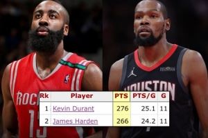 杜兰特火箭生涯前11战合砍276分 超越哈登居队史第一