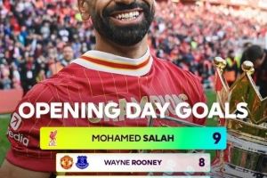 根据英超官方的数据统计,利物浦边锋萨拉赫是英超历史揭幕战进球最多的球员,达到了9球,在他身后的是鲁尼、希勒、瓦尔迪和兰帕德,他们都打进了8球。