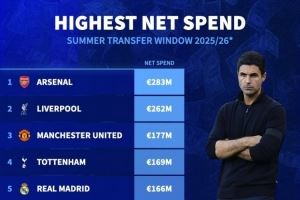 今夏转会净支出排名:阿森纳2.83亿欧居首,利物浦、曼联二三位