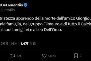 体育资讯9月4日讯 意大利时装设计师、奢侈品牌阿玛尼创始人乔治-阿玛尼离世,那不勒斯主席德劳伦蒂斯通过社交媒体进行了悼念。