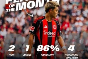 官方:堂安律当选法兰克福8月队内最佳,3场比赛贡献4球1助